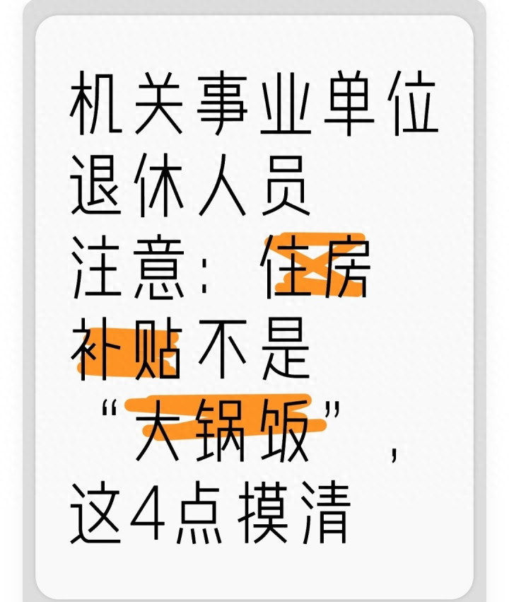 机关事业单位退休人员的待遇里,住房补贴是不少人关心的重点,不少人默认只要退休就能领,领的金额都一样,其实这种想法不对。住房补贴从来不是人人均等的“大锅饭”,能不能领、领多少,都有明确标准,要是没摸清门道,很可能错过该得的待遇,或者误解政策白忙活。今天就把机关事业单位退休人员住房补贴的关键4点说透,全是贴合实际的干货,看完能把这笔待遇拎得明明白白。