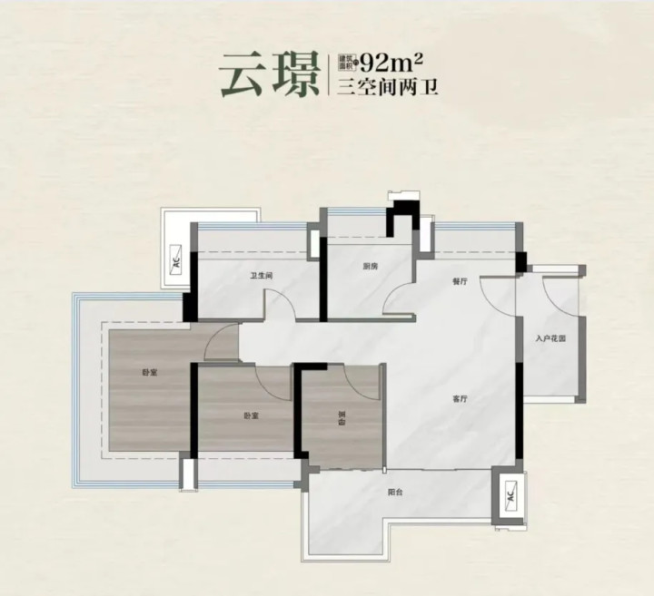 92㎡产品,客厅开间在3.4-3.5米左右,西南向